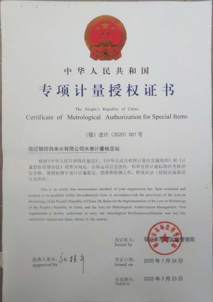 經過現(xiàn)場嚴格考核,根據(jù)《中華人民共和國計量法》、《中華人民共和國計量法實施細則》《計量授權管理辦法》的有關規(guī)定,考核組認為:宿遷銀控自來水公司水表計量檢定站,嚴格按照宿遷市市場監(jiān)督管理局要求開展水表計量檢定工作,全面履行《計量法》賦予的職責和義務,依法辦事,為政府行政計量部門實施計量監(jiān)督提供可靠的技術保證,圓滿通過現(xiàn)場考核。8月7日檢定站取得中華人民共和國《專項計量授權證書》,更為欣喜的是本次《專項計量授權證書》授權期限由往常的3年延長至5年,授權有效期至2025年7月23日。
