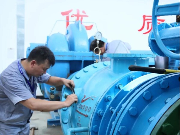 奮戰在一線,確保供水安全。咸寧公司機電設備部技術員陳詩軍接到巡檢人員反映,王英水廠送水泵房水泵運轉異常,立即趕赴現場排查。打開泵蓋后,用手伸進去進行摸查……泵房局部最高溫度達40℃,噪音達60多分貝。盡管維修環境異常艱苦,陳詩軍依舊有條不紊地對設備進行搶修,汗珠掛面臉龐,汗水浸透了衣服,也毫不退縮。