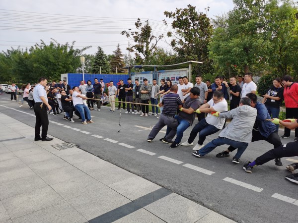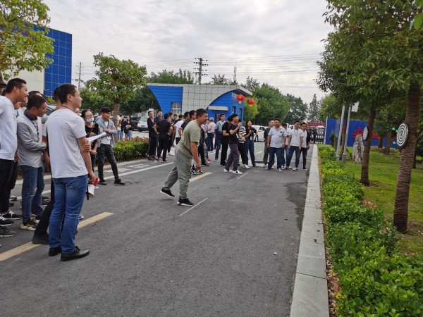 今年的國慶活動共4個項目,分上、下午兩場。上午舉行的是單人項目投飛鏢和團體項目單腳跑火車,下午舉行的是頂球跑和拔河,活動地點在辦公樓前廣場。大紅燈籠高高掛,火紅的橫幅拉起來,國慶節氛圍營造,讓人激情澎湃,辦公樓上“團結、誠信、拼搏、共贏”的企業精神催人奮進。
