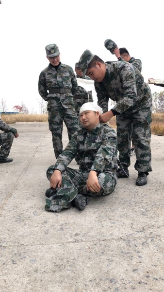 隨著“立正”、“稍息”、“向前看”等熟悉的訓練口號的喊出,本來混亂的人群,在教官的帶領下迅速按照連排劃分整合好隊伍。首先,由軍分區領導給大家做訓練前動員,鼓勵大家不怕吃苦,努力訓練,提高自身本領,努力完成本次集訓。動員結束后,每個連排在各自教官的帶領下有序地向訓練場走去,開展各自訓練。在教官的指導下,我們依次學習了本次集訓的兩個重點項目——防毒面具的操作使用、戰地急救知識學習。這兩個項目實用性較強,首先由教官向大家做一遍操作演練,然后由我們相互練習,最后再由教官進行考核,只有考核合格者才能過關。大家學習都很認真,相互配合,相互學習,最后全部通過了考核。