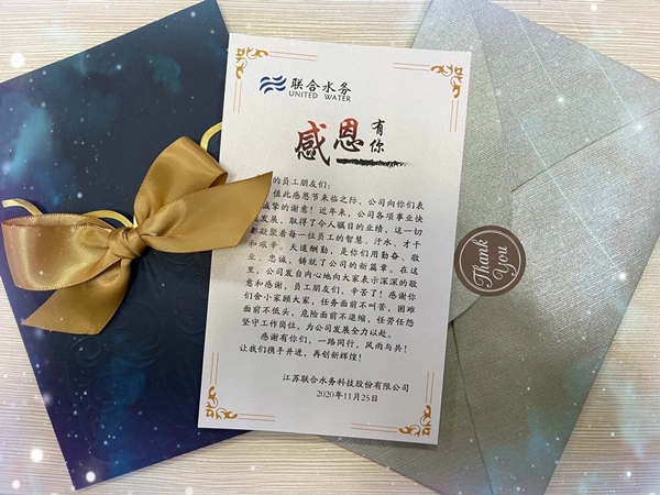 “感恩的心,感謝有你……”一首耳熟能詳、深入靈魂的歌,為我們奏響了感恩的和諧音符。唱響這一首歌,在每段征途,褪盡鉛華后,用心來和。感恩節(jié),是一個西方的節(jié)日,但自古以來,“滴水之恩,涌泉相報”,樂于助人,知恩圖報,就是中華民族的傳統(tǒng)美德。為凝聚公司向心力,豐富企業(yè)文化內(nèi)涵,聯(lián)合水務集團江蘇聯(lián)合水務科技股份有限公司在集團總部的指導下,舉辦了“感恩節(jié)”系列活動,為這個初冬時節(jié)增添一股暖意。