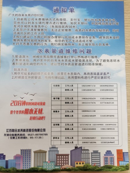 6)專屬通知單發放。各中心大量印刷明信片,上面留有片區抄收員及輔助工聯系方式。利用前臺及抄表員抄表期對片區用戶進行發放,此舉可以讓用戶在對水費有疑問或遇到管道漏水問題時能第一時間和片區負責人取得聯系,以確保嚴寒來臨時能夠有效緩解城區熱線962001及政府12345投訴 “積壓式”的工單。