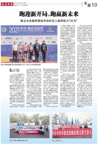 3月28日,宿遷迎來了首屆馬拉松體育盛事。作為宿遷市主要的供水企業,聯合水務傾情助力“遷馬”舉辦,第一時間出資贊助,并組織了百余人參賽。