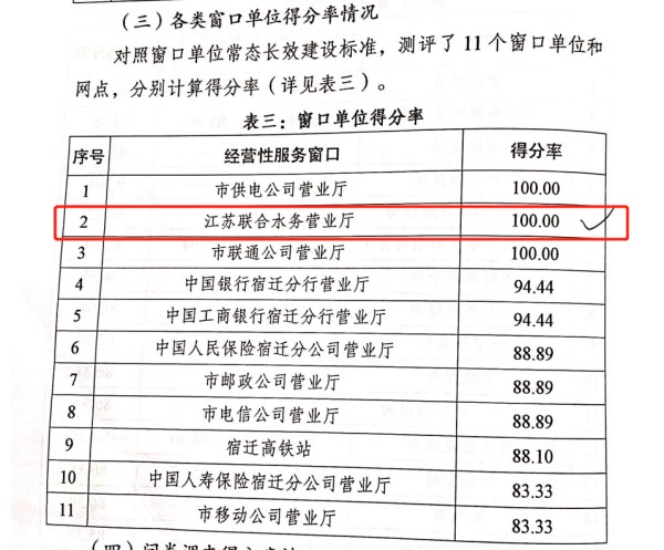 為全面評估今年以來市區文明城市長效建設有效成果,宿遷市長效辦根據年度工作安排,對照2021年版《全國文明城市(地級以上)測評體系》,委托第三方調查機構開展了上半年市區文明城市長效建設指數測評。在此次測評中,江蘇聯合水務科技股份有限公司宿遷公司營業廳榮獲經營性服務窗口100分,排名第一(并列)。