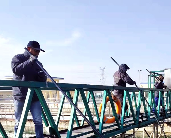 宿遷的最低溫度曾一度降至-10℃,在這樣嚴峻的低溫條件下,沉淀池池面結了一層厚厚的冰,制水部迅速組織人員開展“破冰行動”。在肆虐的寒風之中,鑿冰能手們紛紛大展身手,使用硬質PVC管將2厘米厚的冰面鑿碎,保證吸泥行車能夠正常行駛。