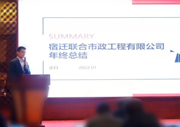 (圖3:宿遷聯合市政工程有限公司總經理梁丹進行2021年工作總結)