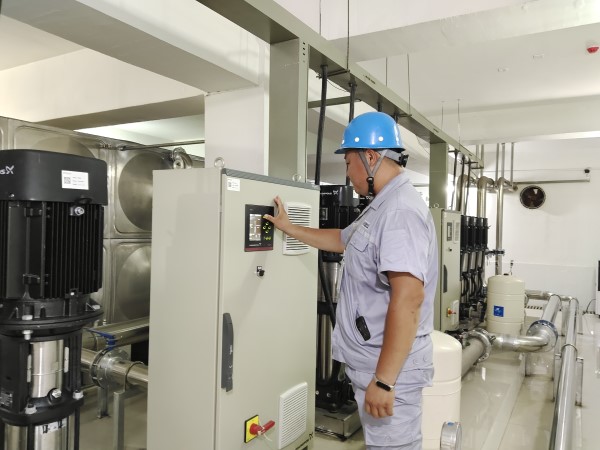 從水源頭到水龍頭,生產部門增加對重點生產設備、泵房及供水線路的巡檢頻次;加強廠區內監控設備、安防設備的維護;持續開展安全隱患排查、突發狀況應急演練;密切關注天氣變化和水廠運行情況,如遇突發故障,搶修隊伍將會第一時間趕赴現場,以最快速度完成搶修,確保生產過程平穩有序。中秋團圓之際,用水量將達到一個小高峰,為此,二供設備服務中心組織巡檢人員對相關供水設備進行拉網式檢查,一方面觀察水箱水流的變化和電氣設備的數值顯示情況并做好記錄,另一方面對備用水泵機組和備用水箱的進水管進行試運行,確保在突發情況下可隨時啟用備用設備。
