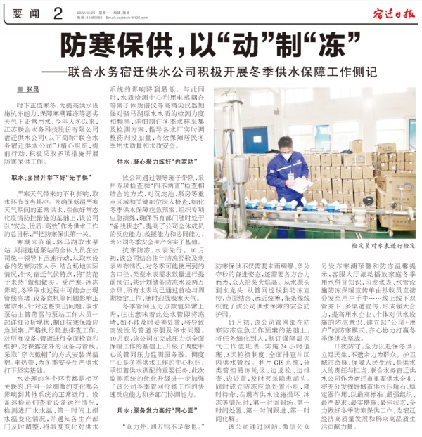 時下正值寒冬,為提高供水設(shè)施抗凍能力,保障寒潮霜凍等惡劣天氣下正常用水,入冬以來,江蘇聯(lián)合水務(wù)科技股份有限公司宿遷供水公司精心組織,提前準(zhǔn)備,積極采取多項措施開展防寒保供工作。