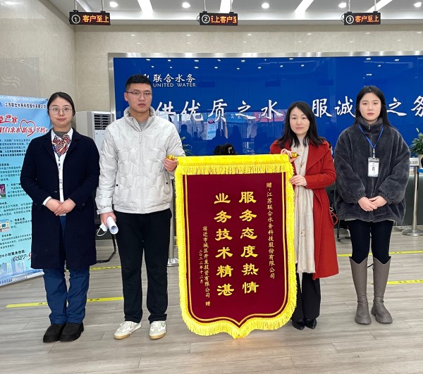 2023年1月13日上午,江蘇聯合水務科技股份有限公司宿遷供水公司客戶服務部收到了宿遷市城區開發投資有限公司(以下簡稱城投公司)贈予的錦旗,以感謝其在用水業務辦理過程中體驗到的優質服務。客戶服務部經理陳美菊代表部門接受錦旗。