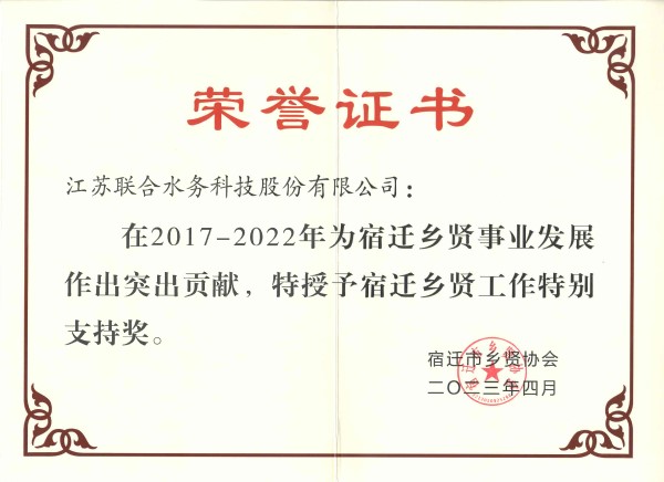 賢抱桑梓情誼深,心懷家鄉(xiāng)織錦秀。近日,宿遷市鄉(xiāng)賢協(xié)會第二次會員大會在駱馬湖總部經(jīng)濟會議中心召開,會上揭曉了宿遷鄉(xiāng)賢獲獎單位名單,江蘇聯(lián)合水務(wù)科技股份有限公司榮獲“鄉(xiāng)賢事業(yè)特別支持獎”。
