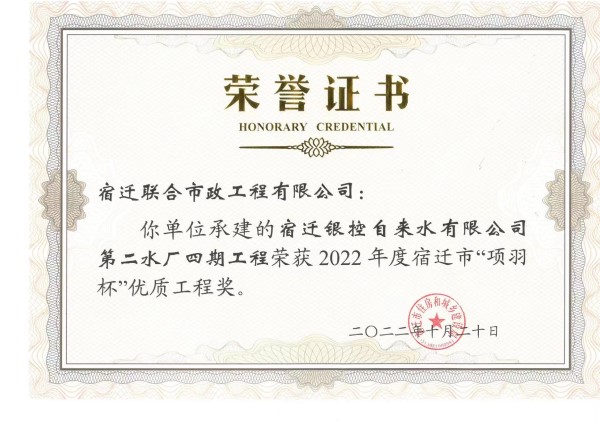 近日,由宿遷市住房和城鄉建設局組織評選的2022年度宿遷市“項羽杯”優質工程獲獎名單正式揭曉。江蘇聯合水務科技股份有限公司宿遷供水公司第二水廠四期工程項目榮獲2022年度宿遷市“項羽杯”優質工程獎。