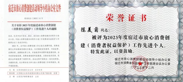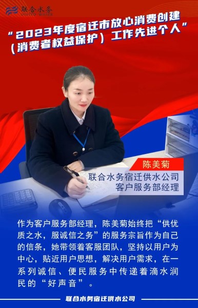 水是生命之源、生產之要、生態之基,讓用戶用上“放心水”,是聯合水務人義不容辭的責任與擔當。近日,為表彰在江蘇省宿遷市放心消費創建工作中涌現出的先進典型,充分調動各方參與放心消費創建工作的積極性,宿遷市放心消費創建活動領導小組辦公室下發了《關于表彰2023年度宿遷市放心消費創建(消費者權益保護)工作先進個人的通報》,聯合水務宿遷供水公司客戶服務部經理陳美菊被表彰為“2023年度宿遷市放心消費創建(消費者權益保護)工作先進個人”。