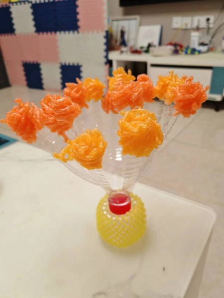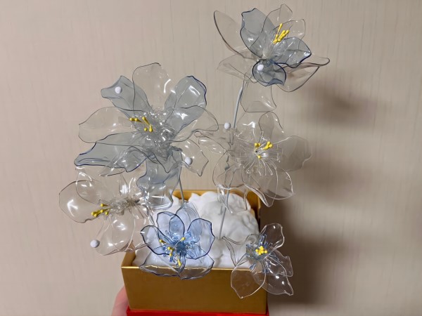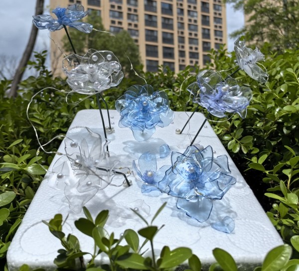 作品采用的透明色和藍色常見飲料瓶制作的塑料花朵,利用塑料在高溫火烤下可以變換形態(tài)的特點,將塑料瓶裁剪后拼接而成的永生花效果,讓平平無奇的塑料瓶瞬間生動形象起來。在世界地球日到來之際,呼吁大家保護環(huán)境的同時發(fā)現(xiàn)不一樣的廢品,變廢為寶,給自己的生活添色。