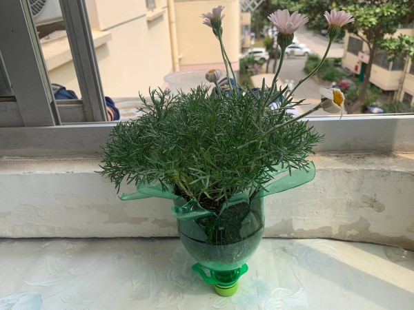 喝完的雪碧瓶經(jīng)過燒邊處理后,就搖身變身成了一個花盆,將植物移植到花盆中,放在窗臺上,成為一道美麗的風景。點綴了窗臺,也為我們的家園增添生機。