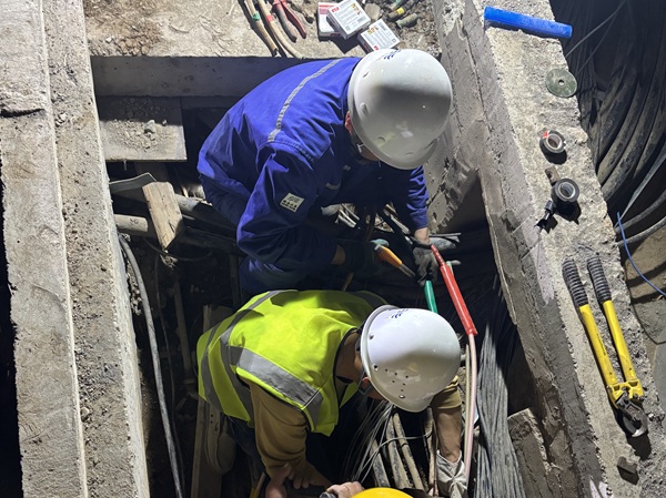 傍晚臨近下班時分,機電設備部接到項目部緊急通知,二水廠五期項目現(xiàn)場有電纜疑似破損發(fā)熱,隨時有斷電風險。機電設備部人員經(jīng)現(xiàn)場查看發(fā)現(xiàn),由二水廠一期低壓配電室通往一二期反沖洗泵房配電間主電纜損壞,隨時可能影響一二期生產(chǎn)運行。搶修就是命令,制水部、機電設備部、項目部快速分工,在保障安全生產(chǎn)的前提下,對破損電纜進行了緊急搶修。搶修人員爭分奪秒,凌晨悄然而至,直到搶修隊伍中有人喊出一聲“回家!”,這場“夜間聯(lián)合作戰(zhàn)”才宣告結(jié)束。