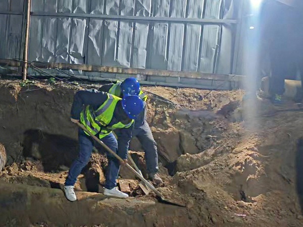 近日,皂河、黃墩、王官集三個鄉(xiāng)鎮(zhèn)DN500供水主管網(wǎng)壓力異常,情況緊急,公司迅速啟動夜間應急響應機制,由管網(wǎng)部總監(jiān)劉朗牽頭,帶隊支援皂河區(qū)域供水服務中心,一支由20余人組成的聯(lián)合巡線搶修隊快速集結(jié),在深夜展開了一場與時間賽跑的搶修戰(zhàn)。凌晨00:30,搶修隊在一處施工場地圍擋內(nèi)發(fā)現(xiàn)了漏點,漏點較為隱蔽,且漏水量大。為盡可能縮短停水時間、減少水量損失,搶修人員迅速制定了維修方案,采用同步作業(yè)模式,機械開挖與人工清淤交替進行,確保作業(yè)高效推進。從發(fā)現(xiàn)漏點到完成受損管段維修,僅用4個小時。凌晨04:30,供水系統(tǒng)全面恢復,高峰期用戶的正常用水得到有力保障。