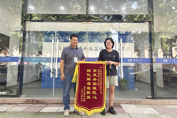 一面錦旗,一份真情。近日,府苑小區一居民將印有“高效務實暖民心,排憂解難顯擔當”的錦旗送到江蘇聯合水務科技股份有限公司。以最質樸的方式表達對公司供水管道高效搶修的深深謝意。面面錦旗映民心,這不僅是對公司搶修效率的肯定,更是對聯合水務“供優質之水,服誠信之務”的生動詮釋。