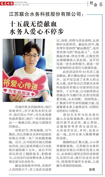 本次活動(dòng),共有43名員工完成獻(xiàn)血,累計(jì)獻(xiàn)血量15500毫升,這不僅記錄下水務(wù)人無私奉獻(xiàn)的赤誠,也映照出聯(lián)合水務(wù)的為民情懷。十五年來,公司堅(jiān)持把無償獻(xiàn)血作為履行社會責(zé)任的重要實(shí)踐,從未間斷,涓涓熱血,凝聚著聯(lián)合水務(wù)人守護(hù)民眾的初心與力量。公司將民生關(guān)懷與社會責(zé)任融入企業(yè)發(fā)展脈絡(luò),持續(xù)組織開展節(jié)水宣傳、愛心幫扶、志愿服務(wù)等活動(dòng)。無論是在社區(qū)、鄉(xiāng)村,還是在公益一線,都能看到聯(lián)合水務(wù)人的身影。