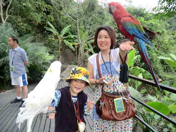 呀喏達(dá)熱帶雨林是近幾年才開發(fā)的景點,“呀喏達(dá)”被海南寓意為歡迎、你好,所以,在園區(qū)里,迎面而來的工作人員都會熱情地以“呀喏達(dá)”來問候你,表示他的友好和祝福。世界各地的熱帶雨林,正以每2秒就消失一個足球場的速度減少,如果這樣的話,幾十年后,熱帶雨林將不復(fù)存在,所以,我們更珍惜這次親身體驗的機(jī)會。雨林中空氣清新,吐納之間,但覺胸中滌蕩一空。景致天然,奇花異草,參天古木,跨河而建的木橋兩邊系滿了木風(fēng)鈴,上面寫滿祈福之語。導(dǎo)游說,上了橋以后大家不要搖晃,因為這是“幸福橋”,你若是左右搖晃,就會把幸福搖走??磥頍o人不珍惜幸福,聽了導(dǎo)游話后,二十余了上了橋全部乖乖地走,沒有一個惡作劇。由于時間充裕,我們坐在雨林長廊內(nèi)休息,聞著清新的草木香氣,聽著林間啁啾的鳥鳴聲,塵間的喧囂被雨林阻隔得不聞不見,內(nèi)心恬淡的快樂難以言表。