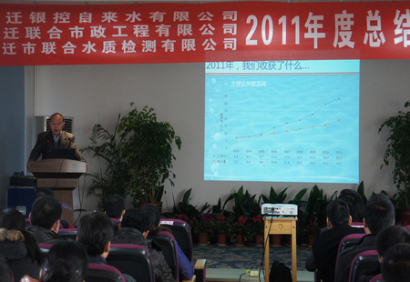 宿遷銀控自來水有限公司總經理夏承光用一系列圖表和數據清晰地反映了2011年的指標完成情況,2011年宿遷公司充分發揮了不畏困難的精神,迎難而上,較好完成了各項預算指標。夏總肯定了成績,同時,他也指出,公司的產銷差、危機管理、執行力等方面仍然有待加強。夏總希望大家在新一年里繼續鼓足干勁,奮發圖強,取得新的突破,再創新的輝煌。