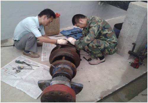 當關閉機泵兩側閥門,準備拆解機泵時麻煩來了。泵前閥門不能完成關閉,并且水量很大,不能夠帶水作業(yè)。請示領導后,我們先關閉泵站1號和2號兩配水井之間的聯(lián)絡閥,讓生產(chǎn)正常運行,再關閉1號配水井的兩組閥門和泵前和泵后的兩組閥門。這些閥門都是手動啟閉的閥門,不經(jīng)常開啟,轉動非常費力。當把舊葉輪拆下時發(fā)現(xiàn),葉輪已被嚴重腐蝕,所以造成產(chǎn)水量不足。