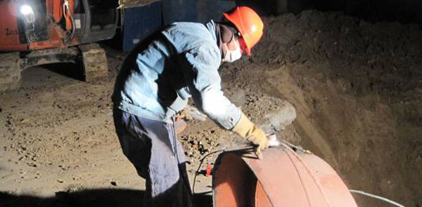 12月10日晚6點左右,公司接到市經濟開發區緊急舉報,人民大道與外環路交界處的DN250螺紋鋼管被現場施工頂壞。管網部趕到現場后發現,此處被頂壞的螺紋鋼管是屬于開發區發電廠自行安裝的原水管道,不屬于我公司維修范圍,但考慮到管網損壞對企業影響較大,本著服務用戶的原則,公司決定免費為其維修。