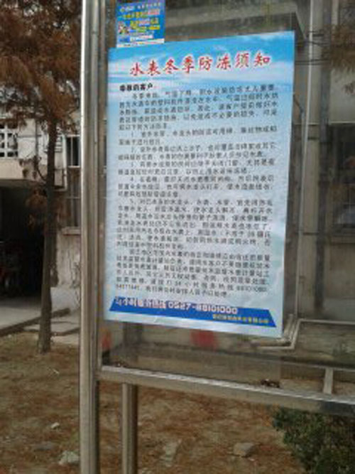 張貼在小區宣傳欄內的水表防凍海報