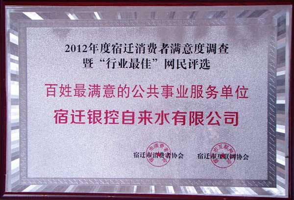 2013年1月23日,“2012年度宿遷市消費(fèi)者滿意度調(diào)查暨‘行業(yè)最佳’網(wǎng)民評(píng)選”活動(dòng)的評(píng)選結(jié)果在宿遷西楚網(wǎng)進(jìn)行公示,宿遷銀控自來水有限公司喜獲“2012年度百姓最滿意的公共事業(yè)服務(wù)單位”稱號(hào)。