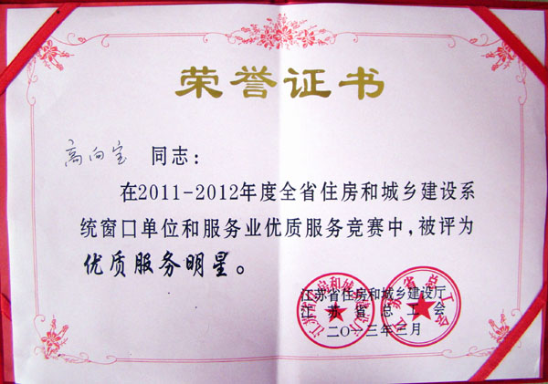 為表彰先進、樹立典型,促進江蘇省住房城鄉建設系統行風建設,提高職工素質和服務技能,推動優質服務常態化,江蘇省住房和城鄉建設廳在全省窗口單位和服務行業中開展先進個人評選活動。經過三個月的評比,宿遷公司客服部受理員高向寶榮獲“2011-2012年度江蘇省住房城鄉建設系統窗口單位和服務行業優質服務明星”稱號。
