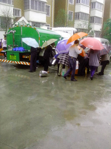 大約1小時左右,兩輛水車駛進停水小區開始送水,兩名稽查員各負責一臺水車。為了使停水造成的影響降至最低,兩名稽查員按要求逐個小區輪流送水,一直忙到中午12時30分左右才結束,此舉深受居民好評。下圖為在聚福園小區送水場景。