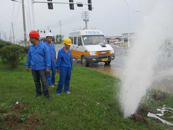 15時(shí)10分,第一輛工程車達(dá)到事故現(xiàn)場,管線組針對具體情況以縮小停水范圍為前提,拿出事先準(zhǔn)備好的管網(wǎng)圖沿線查找并開關(guān)閘閥,同時(shí)及時(shí)告知客服部停水影響范圍,并對周邊工廠進(jìn)行口頭通告和張貼停水通知。維修人員開始整理事故周邊現(xiàn)場。15時(shí)24分,工器具和材料送達(dá)現(xiàn)場,維修人員著手維修。