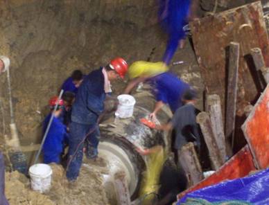 真正開始的搶修是從下午4點開始,在此期間,所有人員精神高度集中,晚上帶黑操作,盡管天公不作美,夜間下起了大雨,電閃雷鳴,這沒有阻止搶修人員的搶修。管網人員克服了大雨、塌方危險等等困難,在120多平方,7米多深的作業(yè)坑里,歷經八道嚴格的工序之后,凌晨12點多,漏點處穿上了一件“金鐘罩”,搶修終于結束。