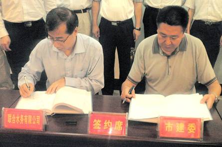 圖一:咸寧市建委主任李華平與聯(lián)合水務(wù)總裁俞偉景正式簽署協(xié)議書。