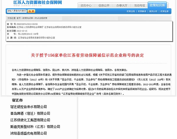 宿遷公司被授予“江蘇省勞動保障誠信示范企業(yè)”榮譽稱號