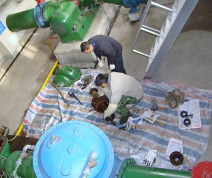 圖一:制水部機組維修人員在修理機泵。他們在操作地面輔上塑料墊層,將拆下的零件放置在墊層上,保持了地面的整潔。