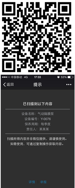 掃一下下面的二維碼,你會發現它能提供設備名稱、設備編號、保養周期、責任人等信息,當然這只是一個樣本,相關人員可以根據需要,添加更多的信息在里面。