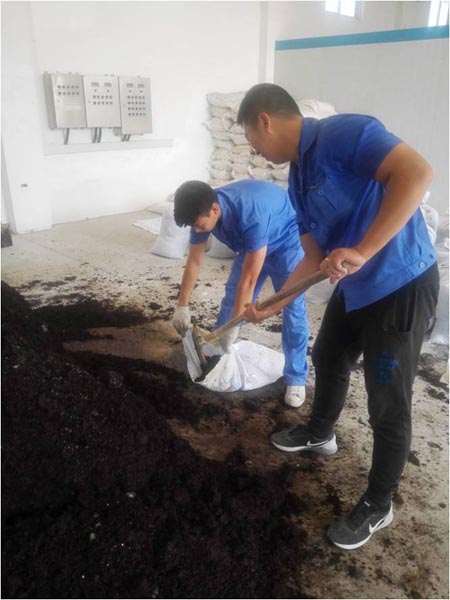 (圖:生產(chǎn)部員工對(duì)散酒糟進(jìn)行裝袋)