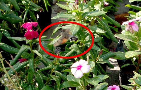 近日,在公司花叢中偶然發現一只罕見的“蜂鳥鷹蛾”,隨手拍照幾張。“蜂鳥鷹蛾”被稱為昆蟲世界里的“四不像”,像蝶,和蝶一樣白天活動,口器是長長的喙管,且有尖端膨大的觸角,還有色彩繽紛、美麗炫目的翅膀;它又像蜜蜂,在夏秋季節飛舞于百花叢中采食花蜜,并發出清晰可聞的嗡嗡聲;它還像南美洲的蜂鳥,夜伏晝出,很少休息,取食時,和蜂鳥一樣,時而在花間盤旋,時而在花前疾馳,顧得此名。(圖1:花叢中的“蜂鳥鷹蛾”)