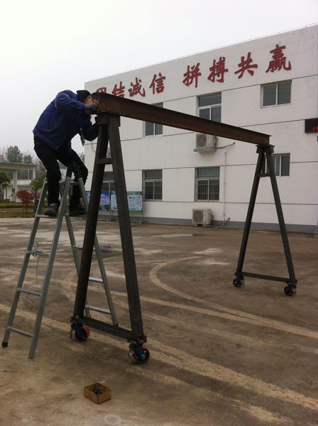 設計方案后,買來材料、量好尺寸便開始了焊制。工字鋼、槽鋼的切割是龍門架制作的重要環(huán)節(jié),但以廠內(nèi)現(xiàn)有的設備實施切割很困難,而且切割工作具有一定的危險性等,加大了龍門架制作的難度,拉長了制作的工時。后經(jīng)機電部同事們幾次研究從新制定方案,在做好防護措施下,最終按照設計的方案切割好材料。