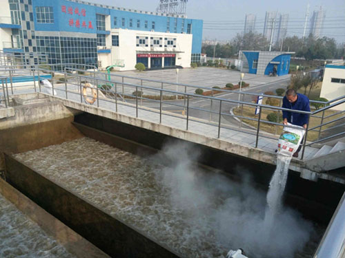(圖:工作人員用漂白粉對濾池進行消毒)