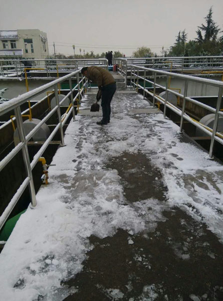 (圖:2.5萬噸濾池上工作人員正在鑿冰)
