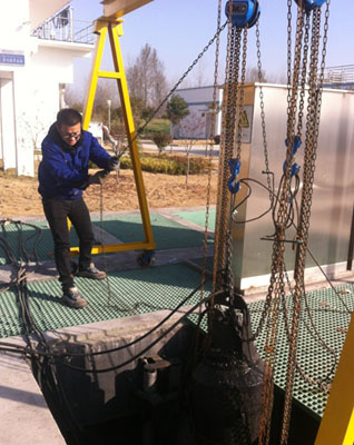 城北污水廠進(jìn)水端集水井深度達(dá)10米,近期在巡檢時(shí)發(fā)現(xiàn)泵體運(yùn)行不太穩(wěn)定,使用自制龍門(mén)架將潛水泵提升起來(lái),進(jìn)行故障檢查。