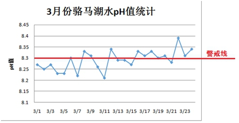 進入3月份以來,駱馬湖水源地pH值異常頻率逐漸增加。
