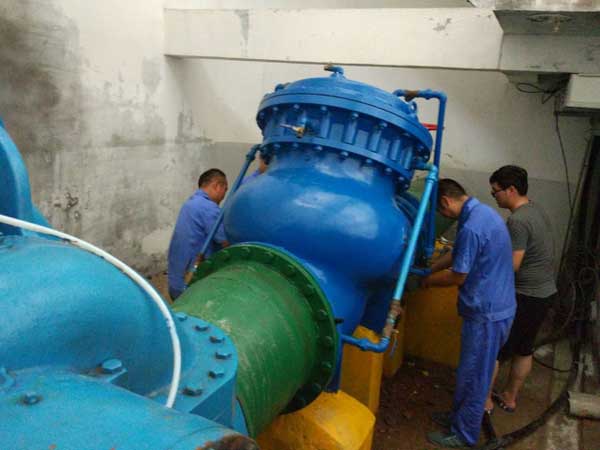 9點05分左右,駱馬湖一號機組出水端伸縮器出現漏水且水量較大、水壓高,需要停機進行檢修。即使關閉出水閥門,仍有漏水現象,只有切換備用水源才能予以維修。經請示,上午10點10分左右完成了水源的切換工作,機電部門人員便開始對伸縮器和閥門進行拆解維修。此時正值高溫時段,泵站內由于電機工作放熱,溫度更是逼近39攝氏度,在連續奮戰了7個小時之后,終于將損壞的伸縮器更換完畢,完成了閥門的修復工作。此時大家都已經體力透支,短暫的休息之后,緊接著又趕往運河泵站開關閥門和機組,將水源切換回來。晚上8點,整場維修終于結束。