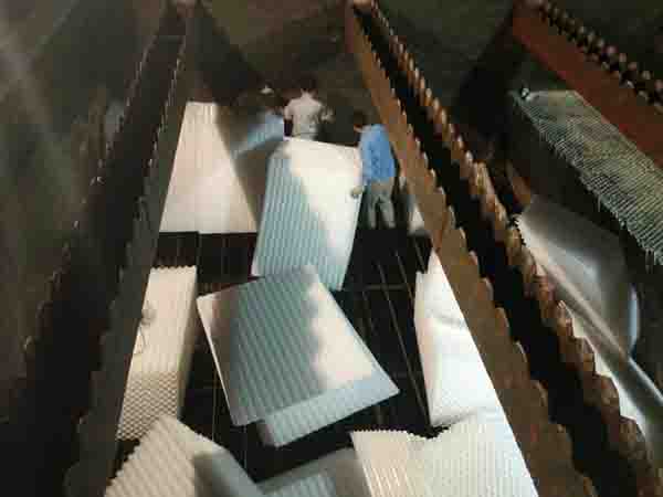 10月3日,隨著用水量的下降,具備了較好的施工條件,于是制水部門抓緊組織人員開啟維修工作。首先對1.5萬噸系統(tǒng)進(jìn)行施工,其底部支架已經(jīng)塌陷,部分斜管掉入池底。由于支架老化嚴(yán)重,承載能力不足,因保證安全下池操作人員不能超過2人,所以清理舊斜管和支架工作進(jìn)展較慢。經(jīng)過連續(xù)8個(gè)夜間的緊張工作,終于將1.5萬噸、2.5萬噸系統(tǒng)的舊斜管清除并修復(fù)了底部斜管支架,更換了新斜管,系統(tǒng)通水后,水質(zhì)明顯改善,沉淀水濁度低于2NTU,水質(zhì)清澈見底。