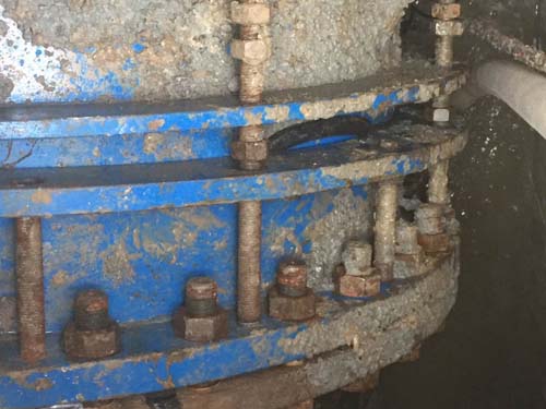 原計(jì)劃3月初完成管道的試壓和清洗工作,然后正式供水,但3月6日注水時(shí)發(fā)現(xiàn)微山湖路DN1400井室內(nèi)向外冒水,停止注水排空井室內(nèi)水后,發(fā)現(xiàn)DN1400伸縮器墊片部分位置錯(cuò)位并斷裂導(dǎo)致漏水。