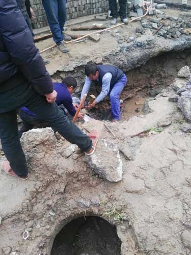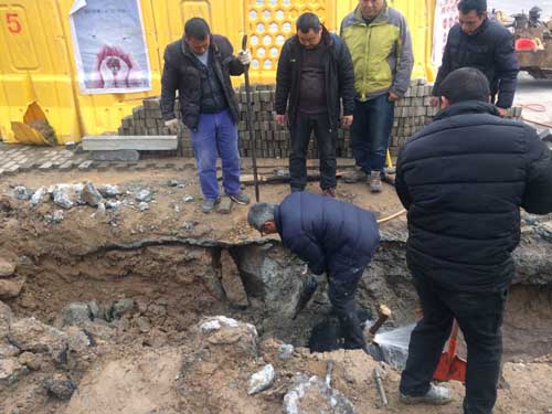 接到熱線后,管網(wǎng)部立即安排維修員趕赴現(xiàn)場查看情況,原來是主管道上有明顯漏水點,且漏水量較大,水柱向上噴射10米左右。得知情況后,緊急制定維修預案,準備搶修工具、調(diào)配人員組織搶修,因為是供水主管道不能停水搶修,情況非常緊急。公司領導當即決定對破損點進行二次深挖,先調(diào)動大型挖掘機進行了大范圍清除,而后人工將管體清理完畢。