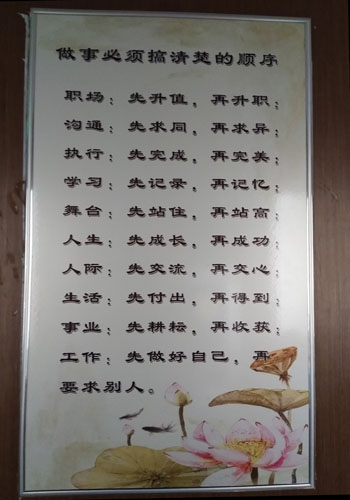 前不久,因?yàn)榻Y(jié)算“綠洲豪庭”工程款的事,跑了多趟“萬源商廈”,他們辦公室廊道上貼著的一些標(biāo)語引起了我的注意。