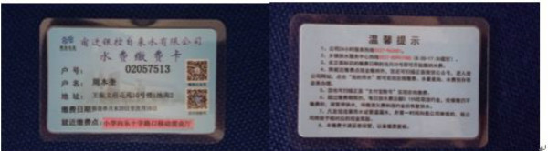 首先,重新制發(fā)新版繳費卡。之前使用的繳費卡,不僅顏色單一,且卡中包含的信息也少。中心根據(jù)市區(qū)客服部已定稿使用的新卡作為藍本,結(jié)合鄉(xiāng)鎮(zhèn)實際印制了新的繳費卡(如圖所示)。中心根據(jù)移動或郵政惠民及民豐銀行快付通等代收點的分布,通過抄表員對以表冊為單位的用戶就近繳費點的確認(rèn),在新卡上標(biāo)明了就近繳費點。