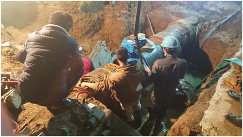 在趙總的指揮下,深夜10點半,緊張又忙碌的改造工作開始了。2.5萬噸的改造與1.5萬噸的改造有明顯的不同,連接管道由鋼管變成了鑄鐵管,原來的氧氣乙炔切割是達不到鑄鐵管道的熔點,需要切割機慢慢的切割才能完成,奈何管道壁厚太厚,直到晚上11點半依然沒有什么進展。現場,趙總、丁經理帶領大家討論方案,確定使用焊機電焊點焊管壁讓局部溫度高于鑄鐵熔點,最終在凌晨0點30分終于完成了管道的切割。